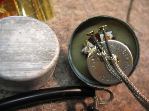 The pickups checked out and worked perfectly. What didn’t age so well, however was the wiring itself. Gibson has always used a single insuated conductor wire with a metal braid as a shield. Over the past 40-some years, the inner wire’s insulation has dried and crumbled. This allows the inner hot wire to rub against the grounded braid, shorting the signal completely in some cases.