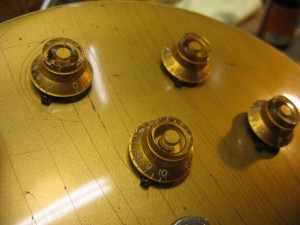 Those original goldtops got their look from clear lacquer finish applied over bronze powder. Over time, the clear finish would wear thin and ‘check,’ exposing the bronze to arm sweat and the oxygen in the air. As a result, many of these 50+ year old guitars have taken on a greenish appearance in the more heavily worn areas. The Greco’s owner knew this and specifically wanted to see this subtle effect on his guitar – which means simulating fifty years of wear and tear in a brand new finish. You’ll see we were up to the challenge.