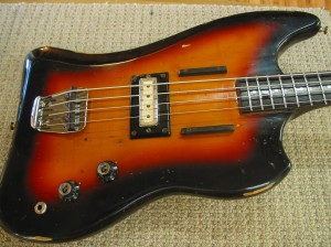 The buyer lives in France and the seller lives in Chicago. So before it shipped, the new owner of this vintage Guild Jetstar Bass asked that it be brought here so we could remove a clear refin, and restore its original 3-tone sunburst look. The trick, was to make the new body finish blend in with the original burst finish still on the neck.